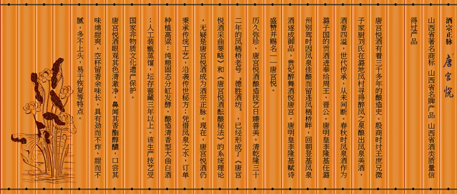 鳳棲橋釀業(yè)有限公司歷史悠久。從殷商微子家廚劉氏尋鳳泉釀酒至今,已有三千多年釀造史。劉氏后裔代傳代善, 才有唐明皇李隆基賜名“唐宮悅”,到清乾隆三十二年的鳳棲橋老號“德勝酒坊”已形成了《唐宮悅酒采曲要略》和《唐宮悅酒醞釀秘法》的系統(tǒng)理論的系統(tǒng)理論,直至建國初期的一九五二年才被當時的潞城邊區(qū)酒坊所接管,一九七四年改邊區(qū)酒坊成立國營潞城縣酒廠,二00六年改制為現(xiàn)公司公司地處晉冀豫三省通衢素有“商賈云集旱馬頭”美譽的微子古鎮(zhèn)……【詳細
